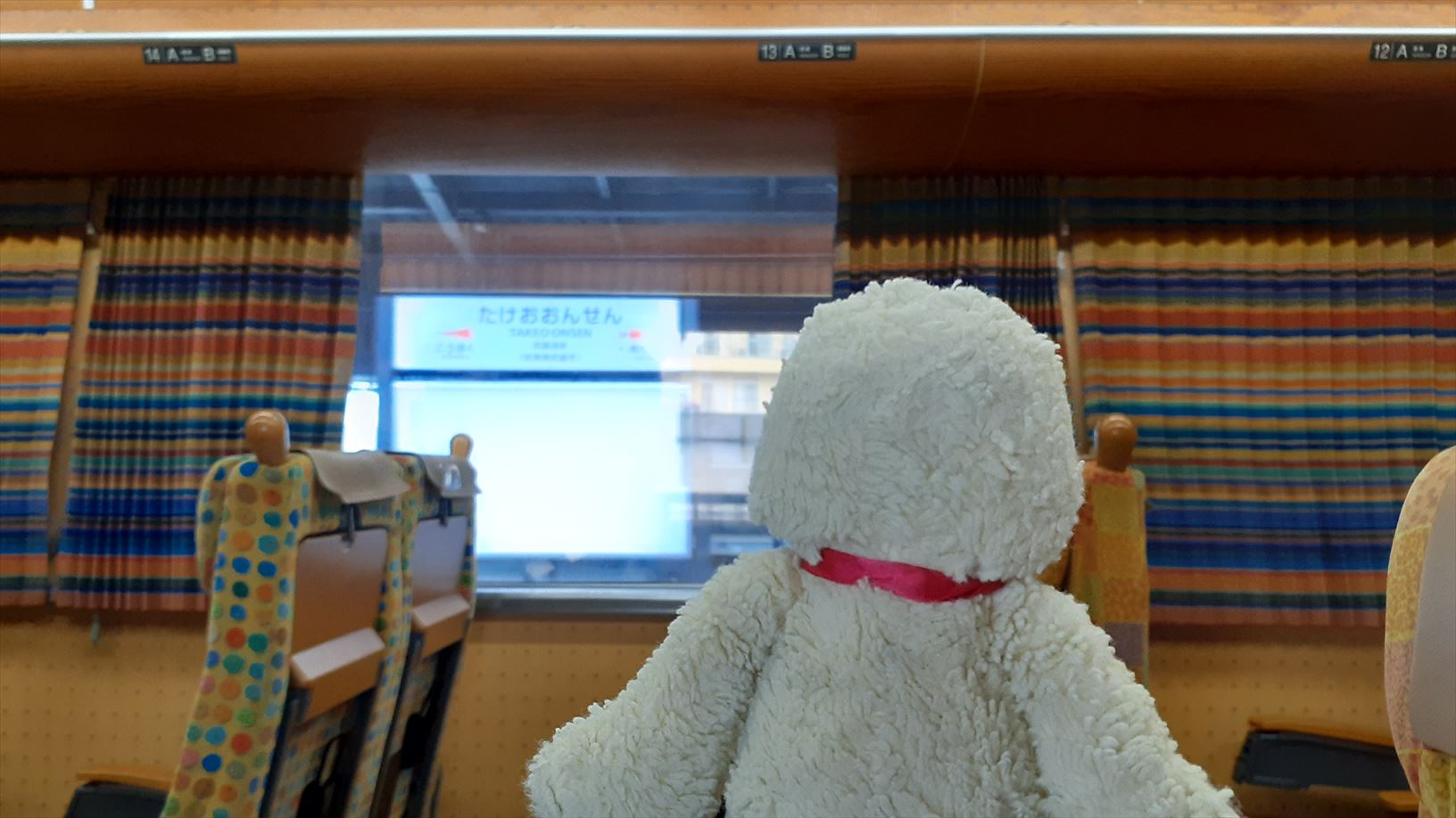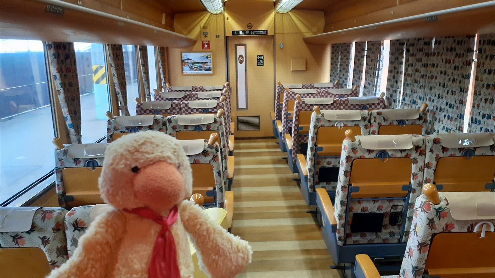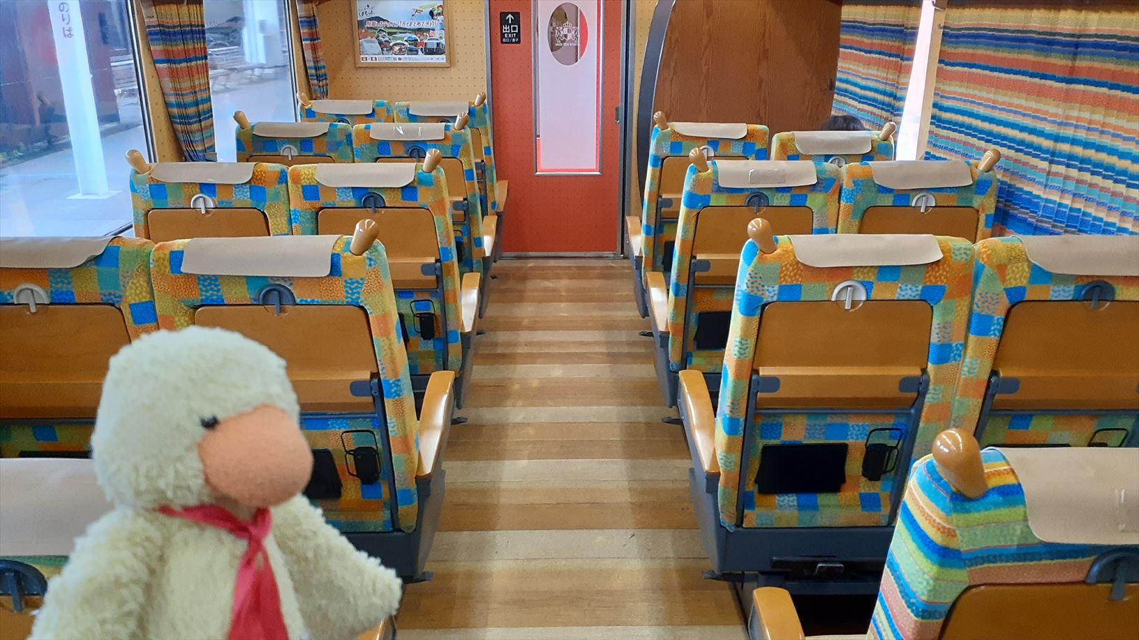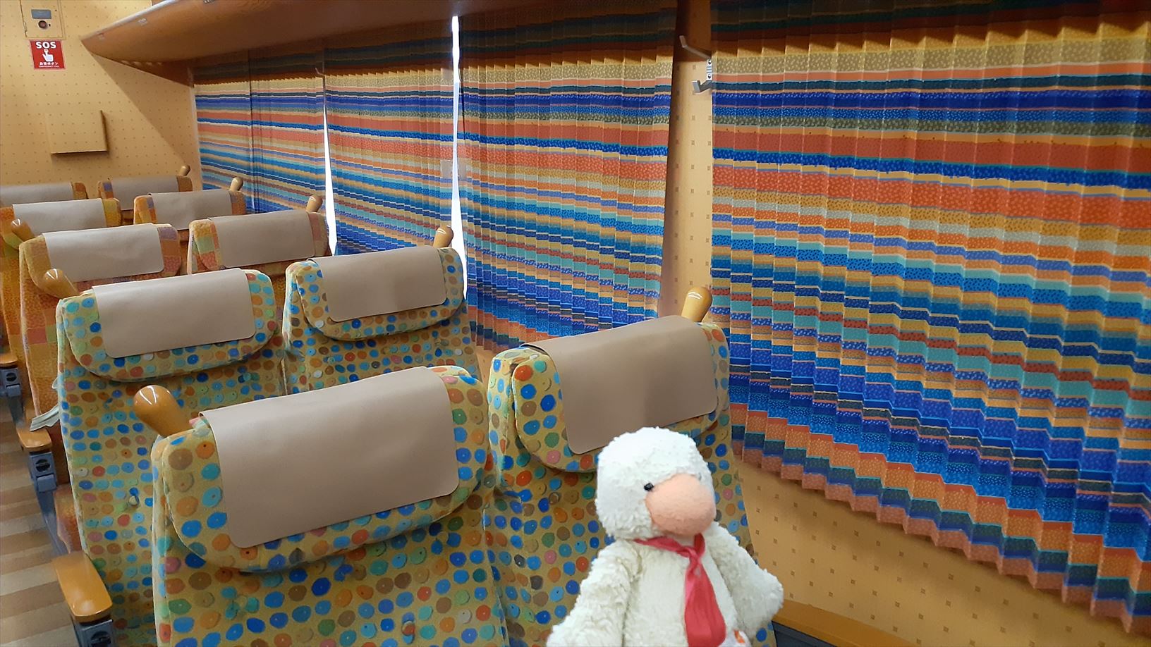 車内は乗る位置によってシートやカーテンの模様が変わります。