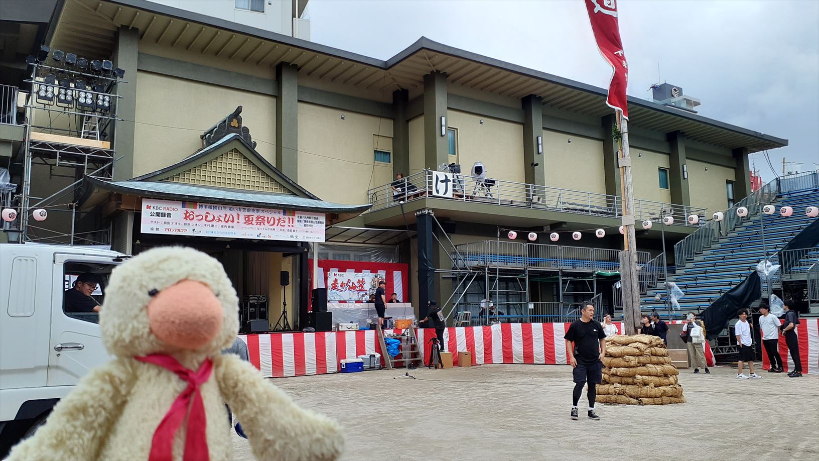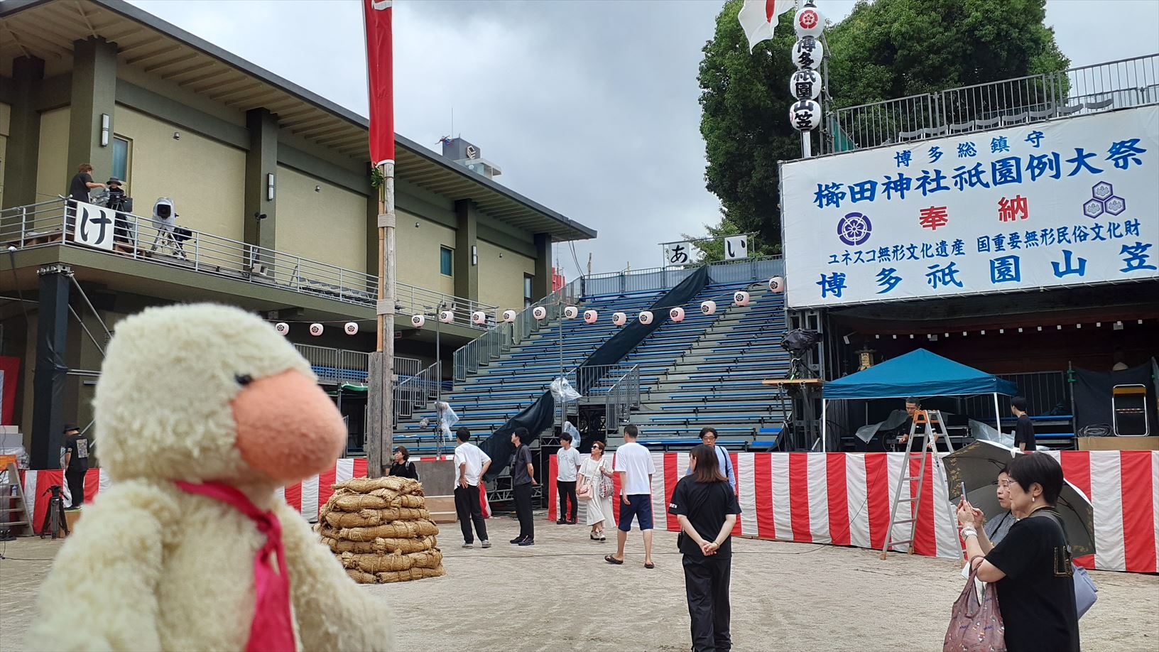 櫛田神社の前はテレビ局の中継スポットを設営〜準備中。