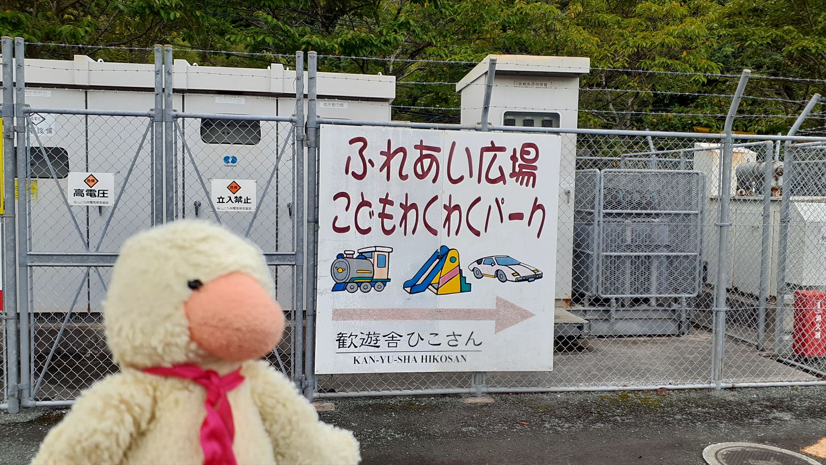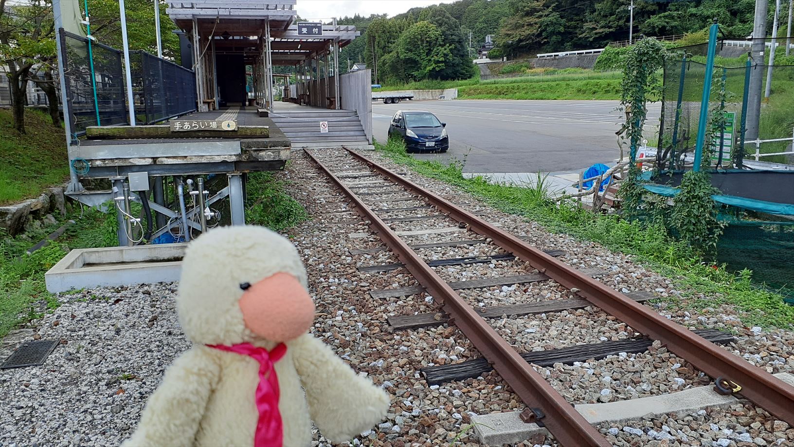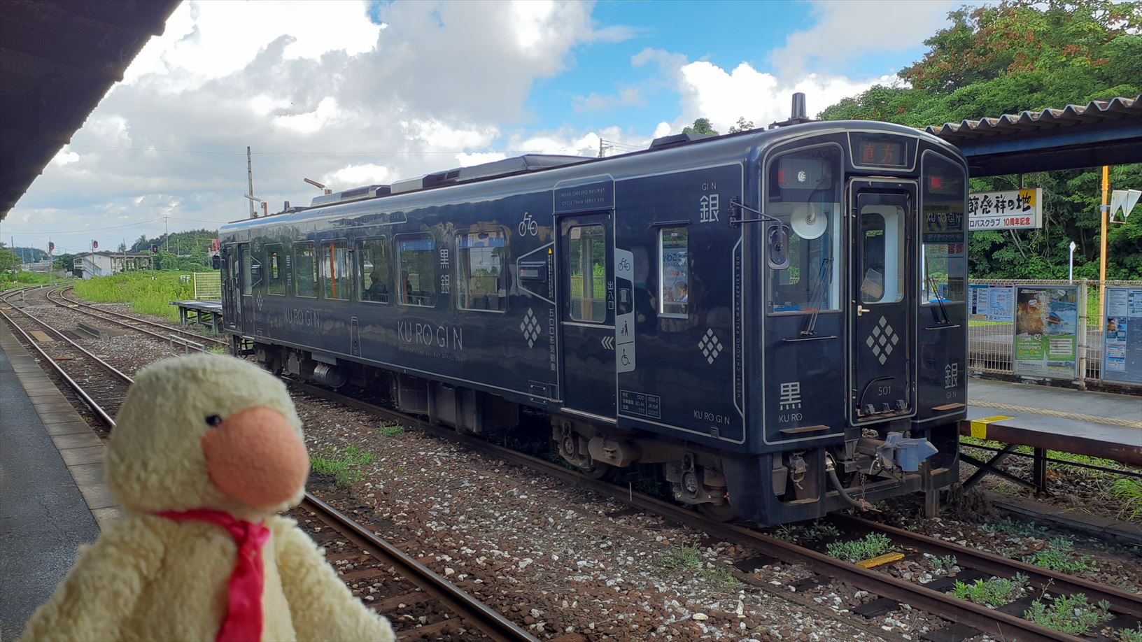 鉄道駅へのアプローチの看板の裏面が・・・そのままやのぉ。
