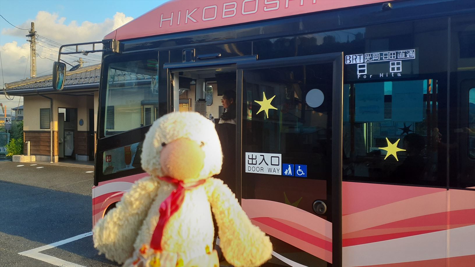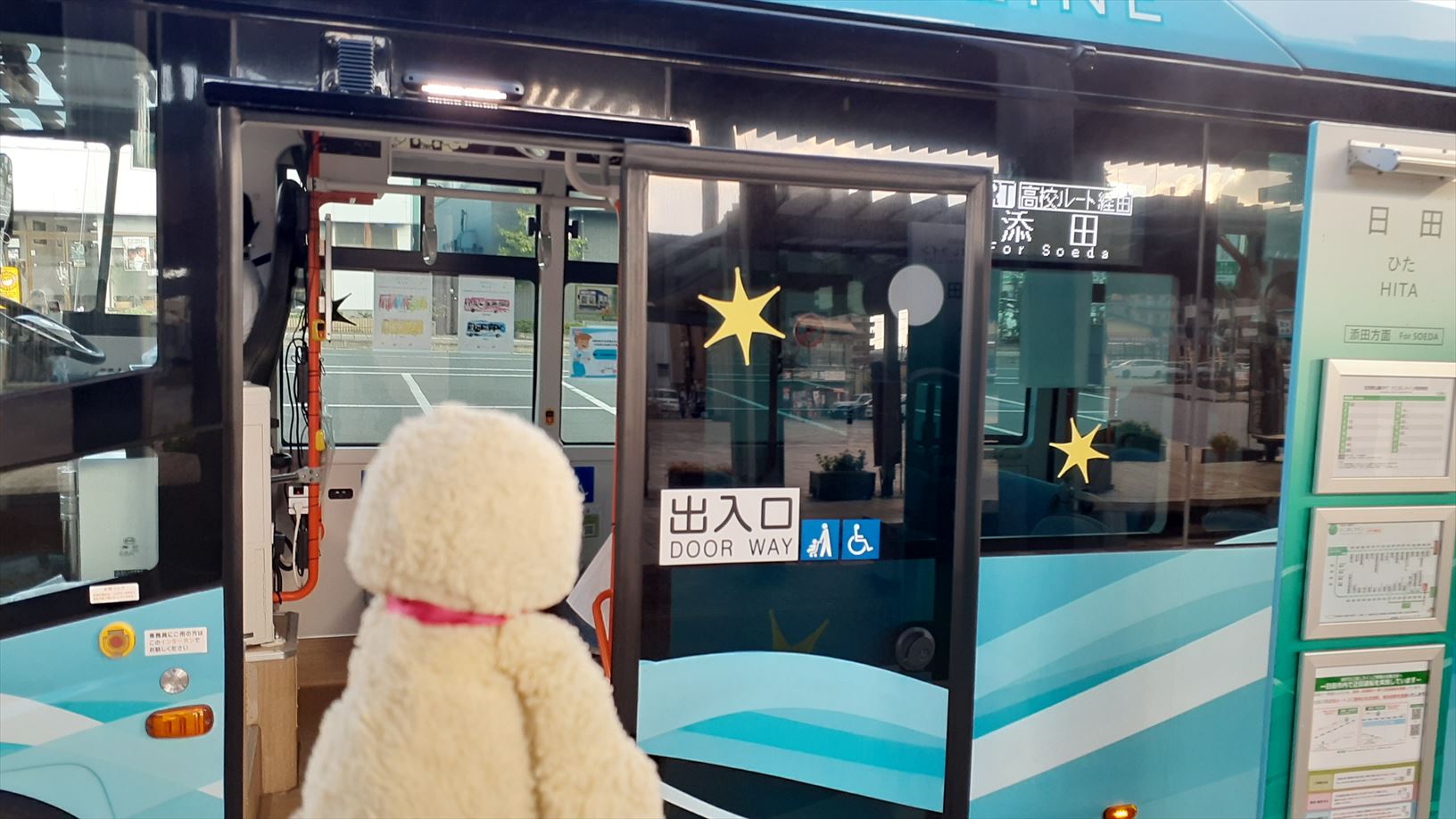 光岡駅で水色のバスからピンクの日田ゆきのバスに乗り換え・・・