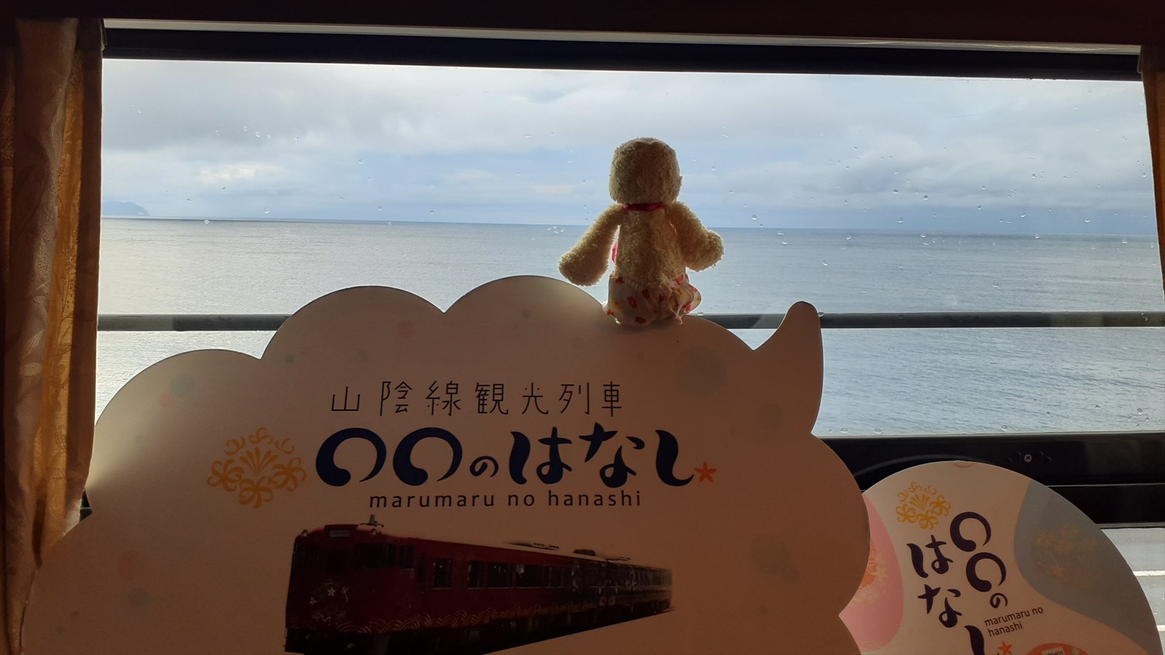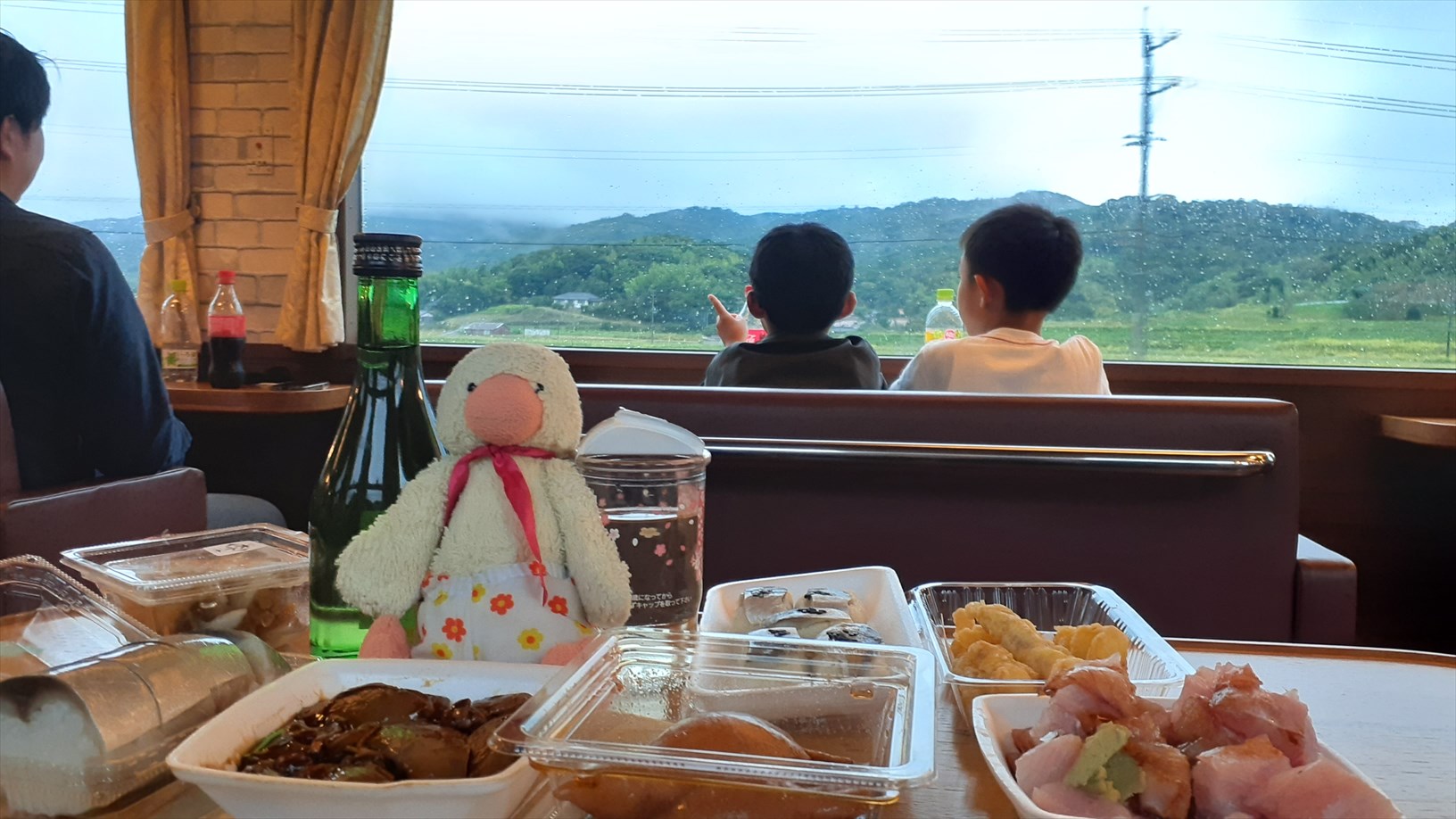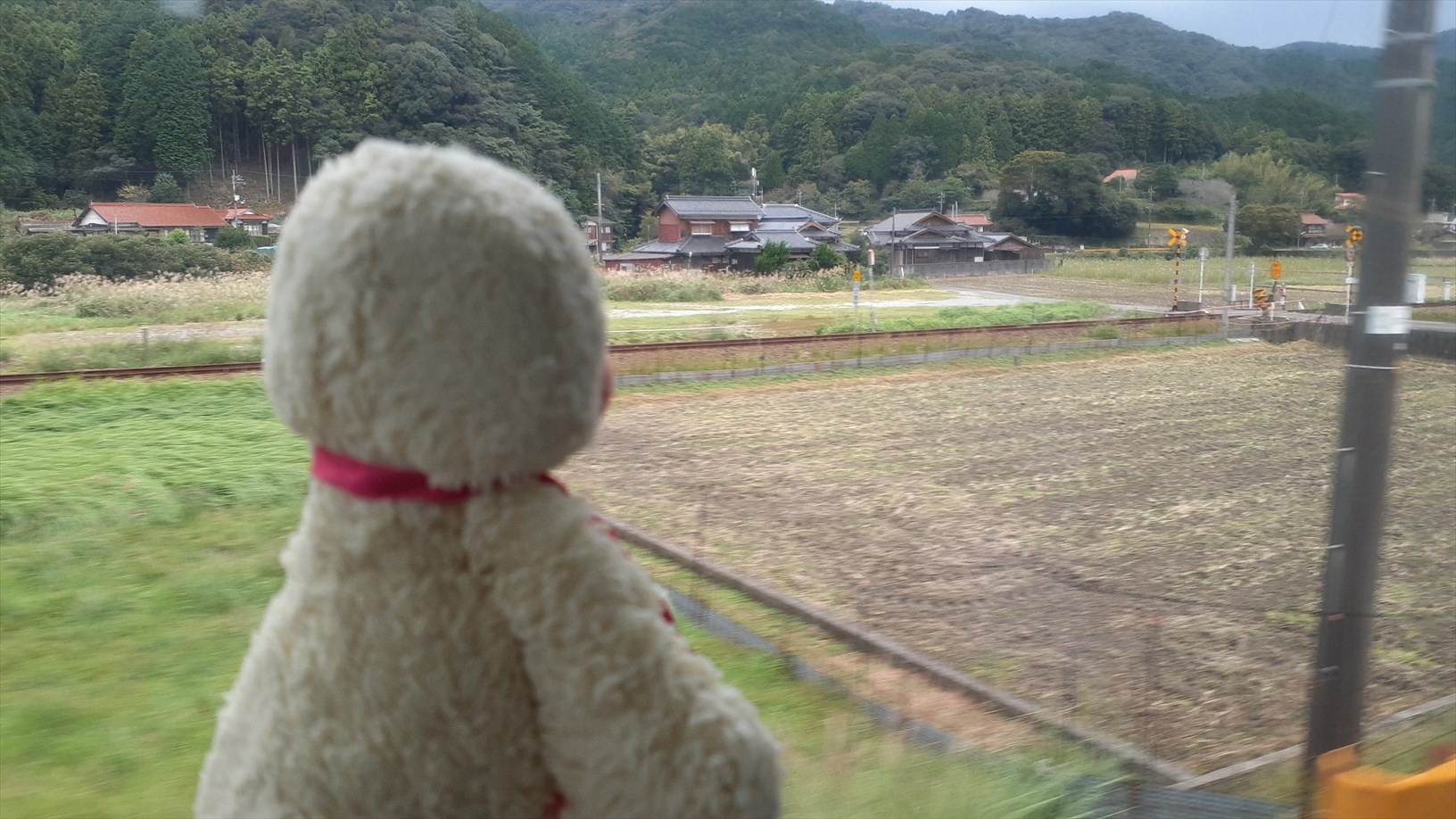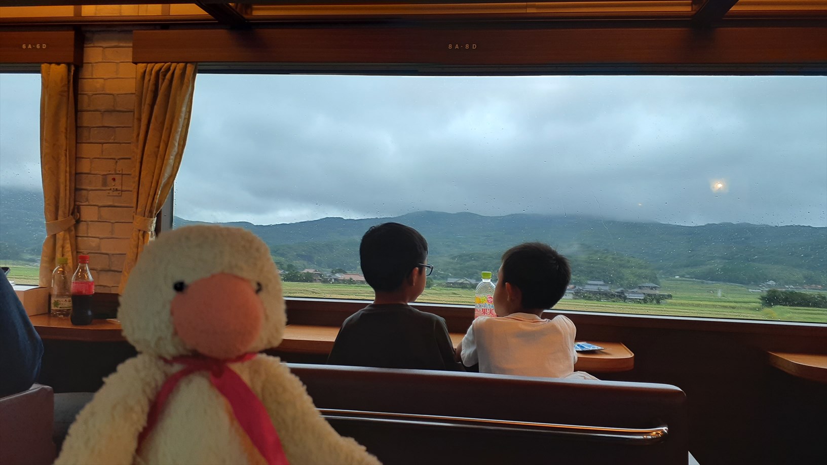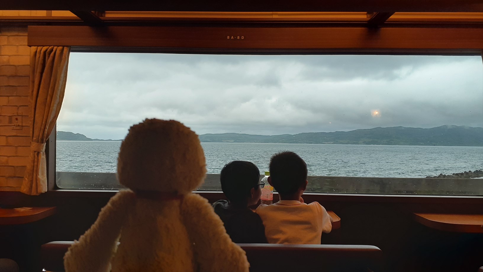 2号車は片側の窓向きに並んでいて、たけじろうは山側の窓。(曇天ビュー)