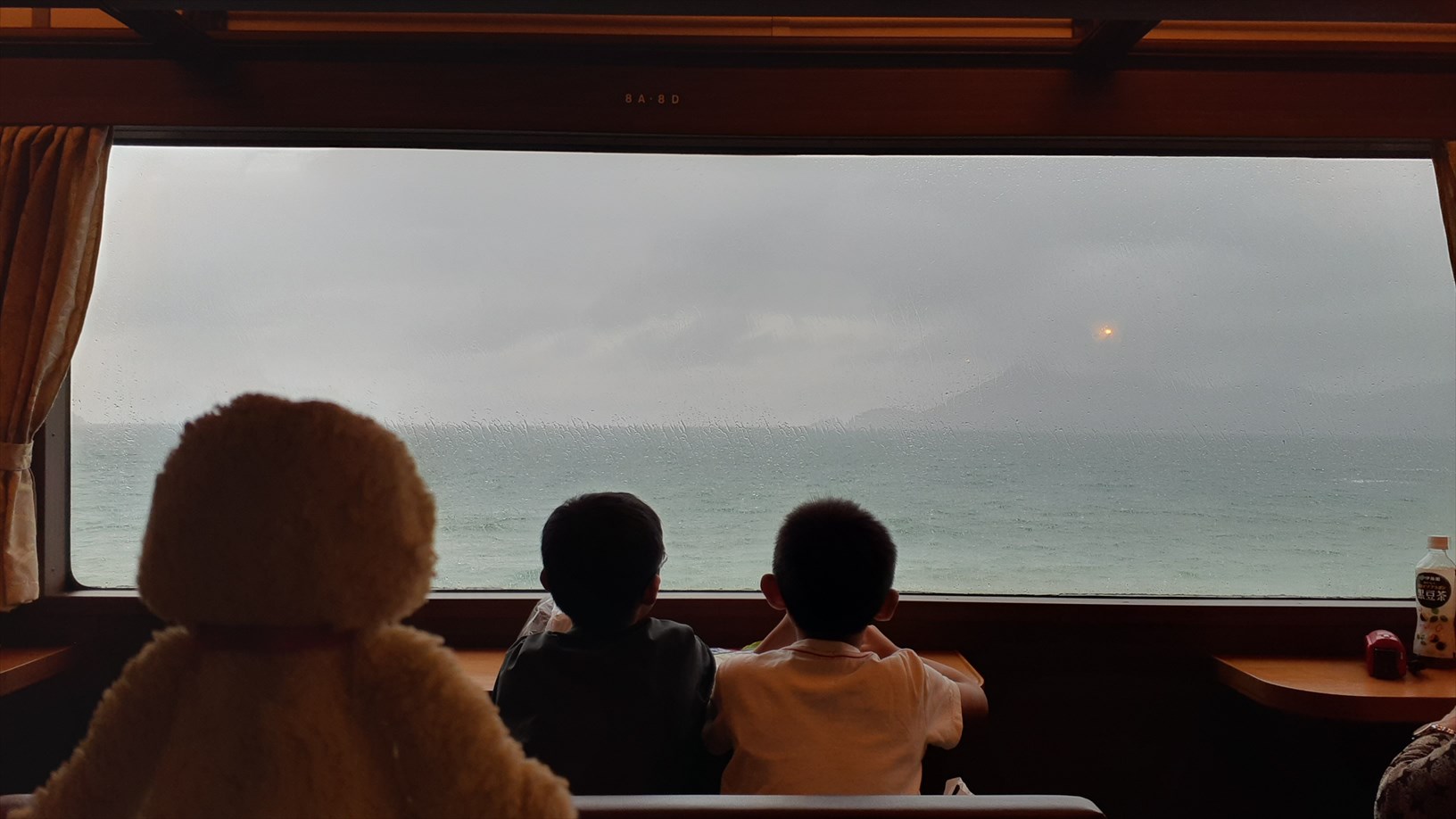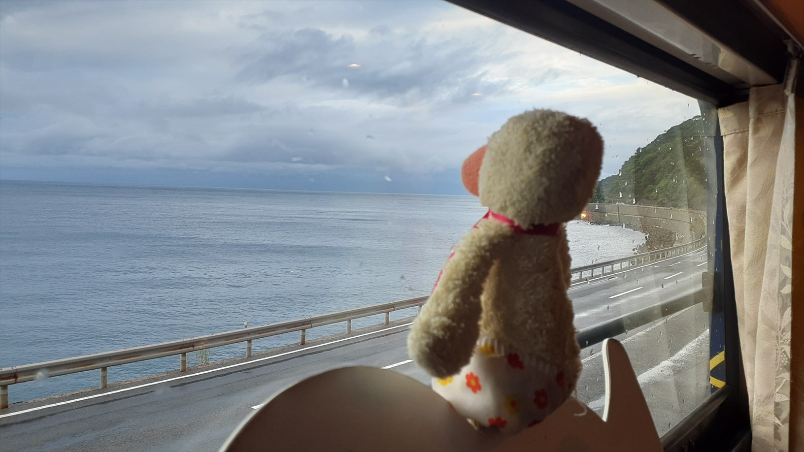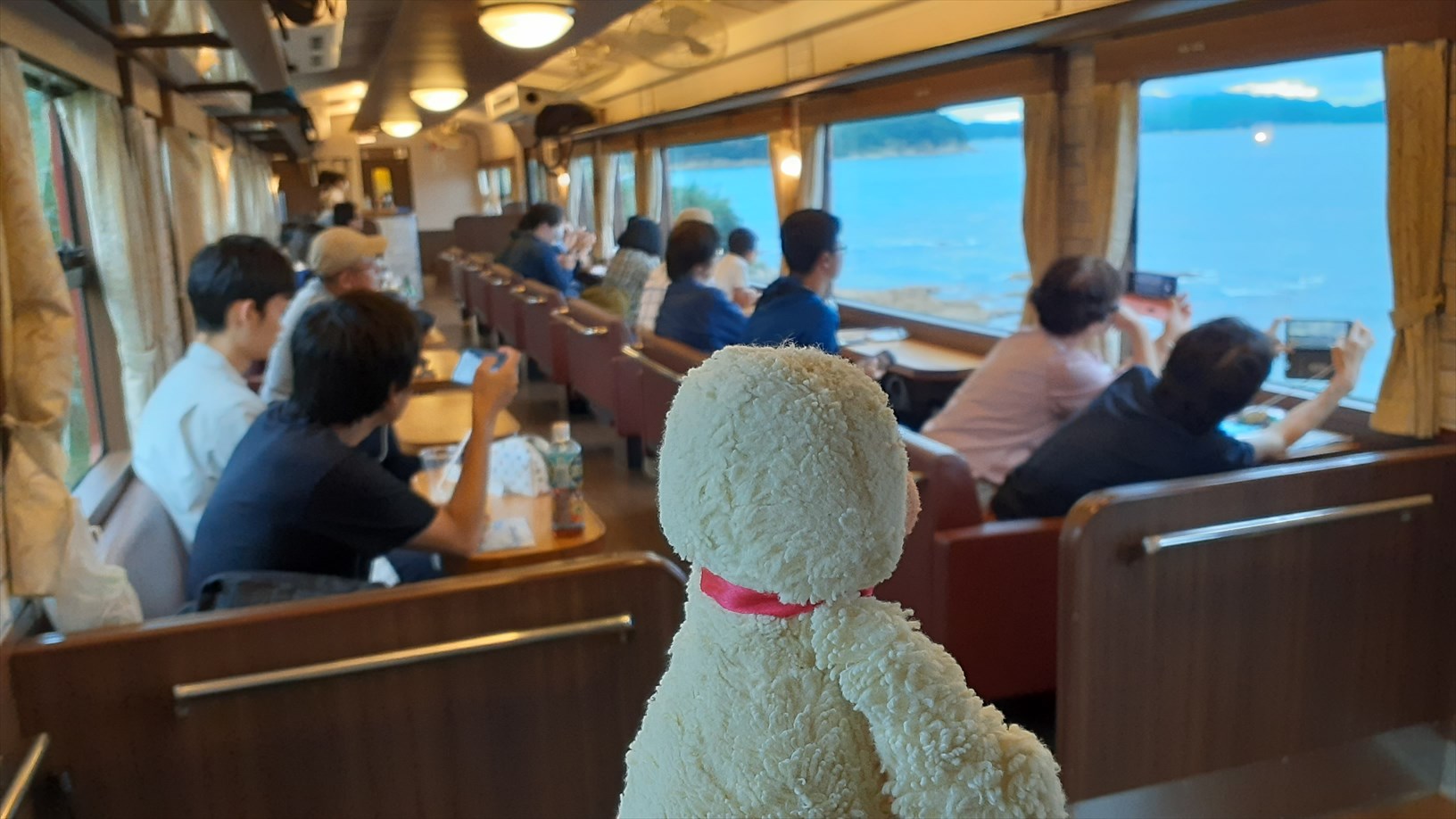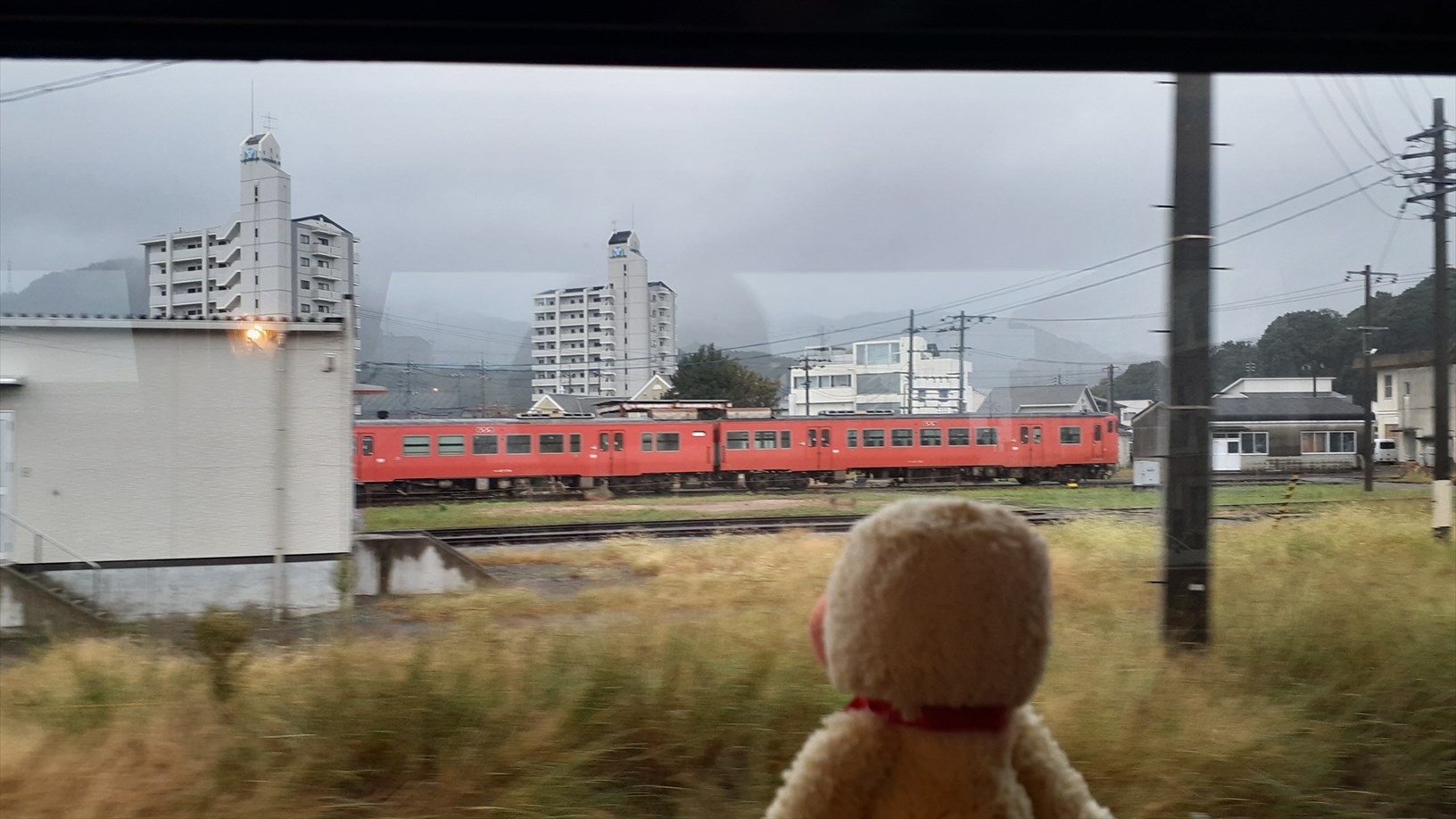 2号車は片側の窓向きに並んでいて、たけじろうは山側の窓。(曇天ビュー)