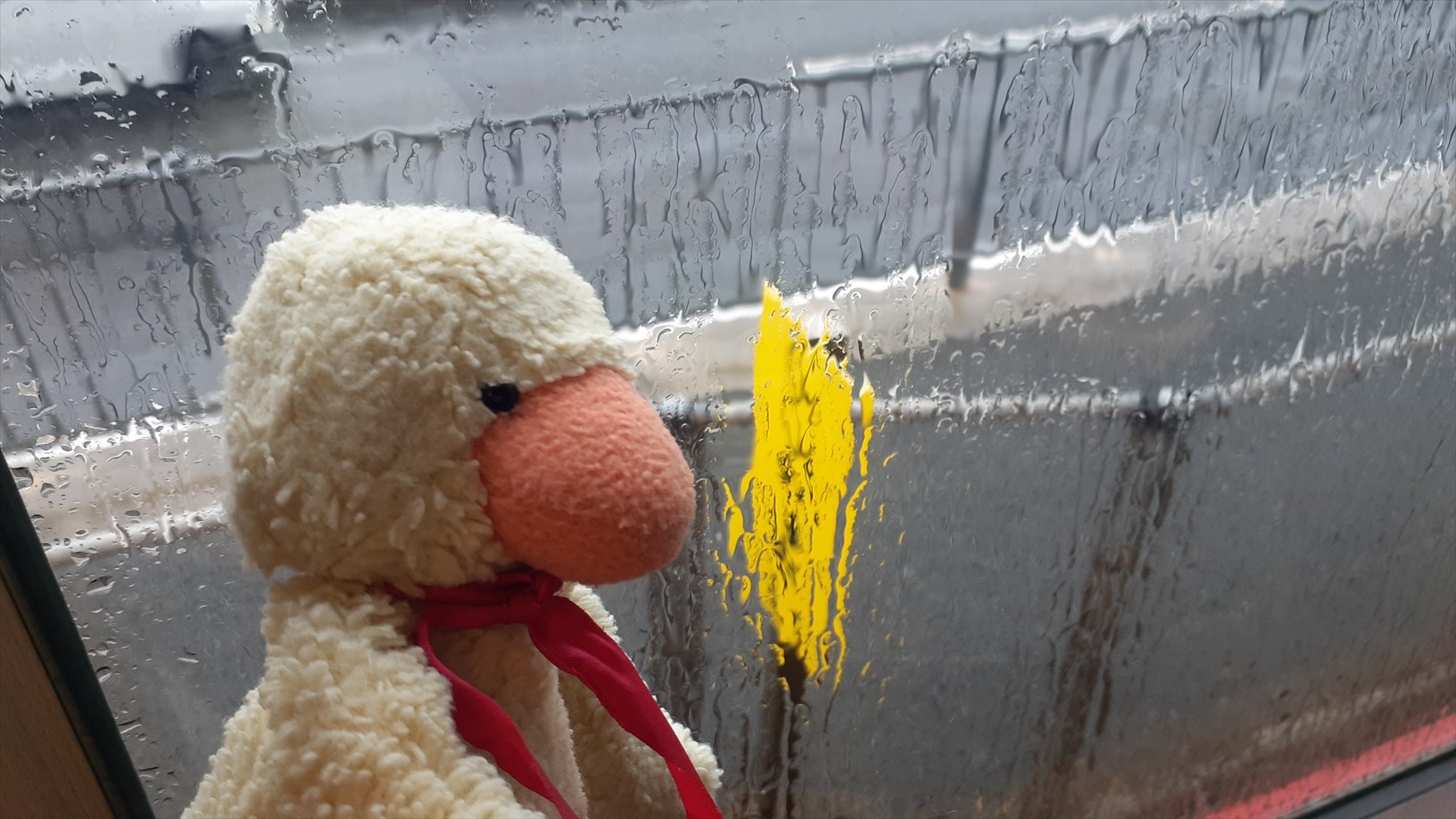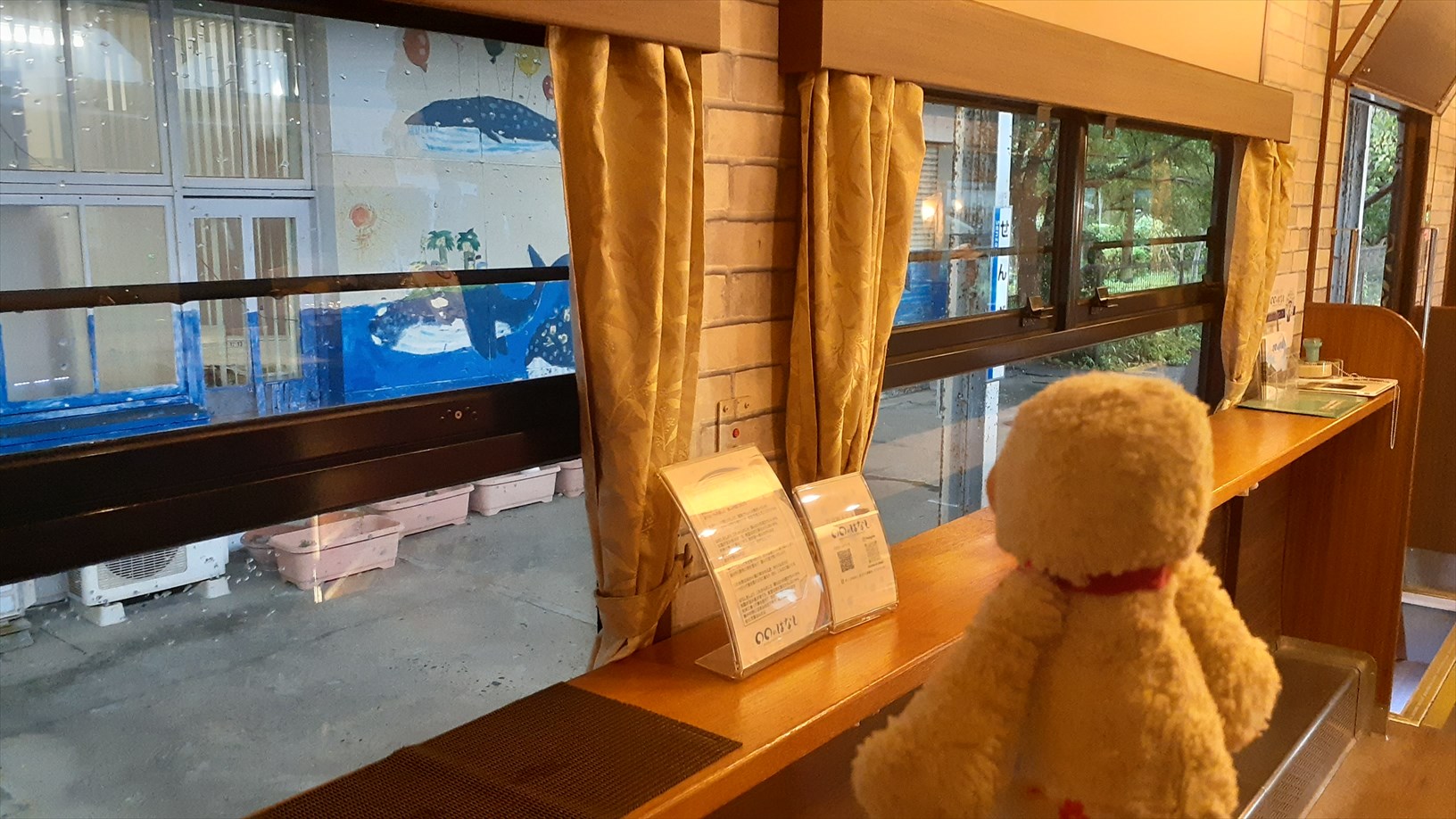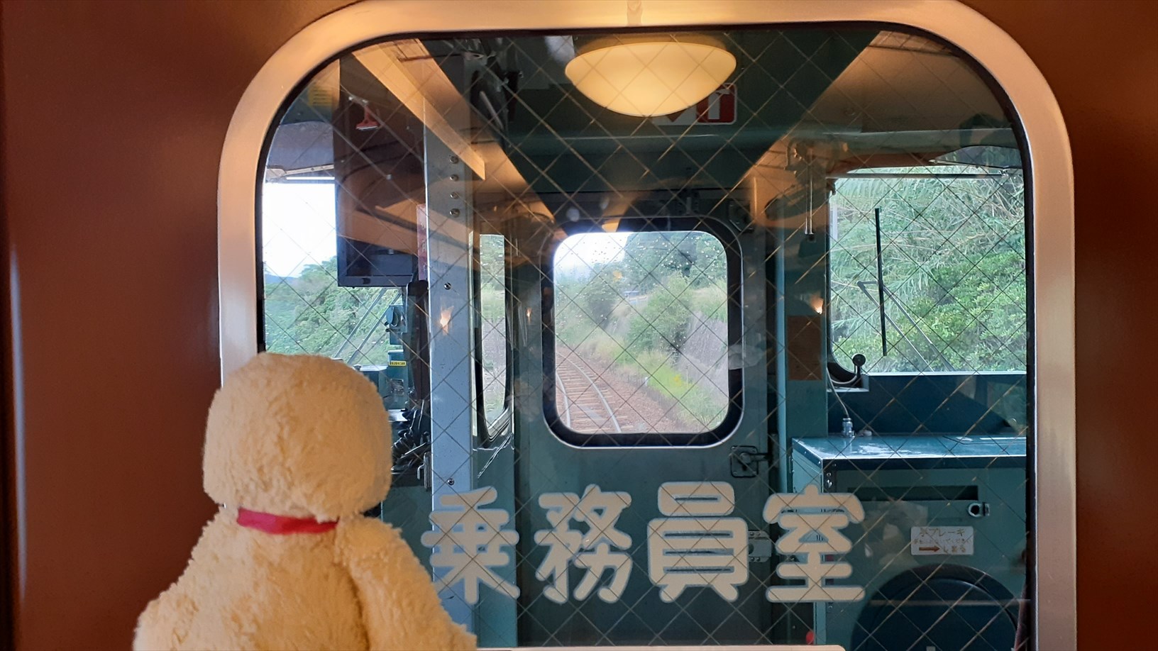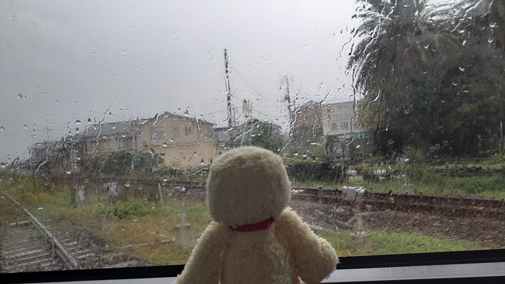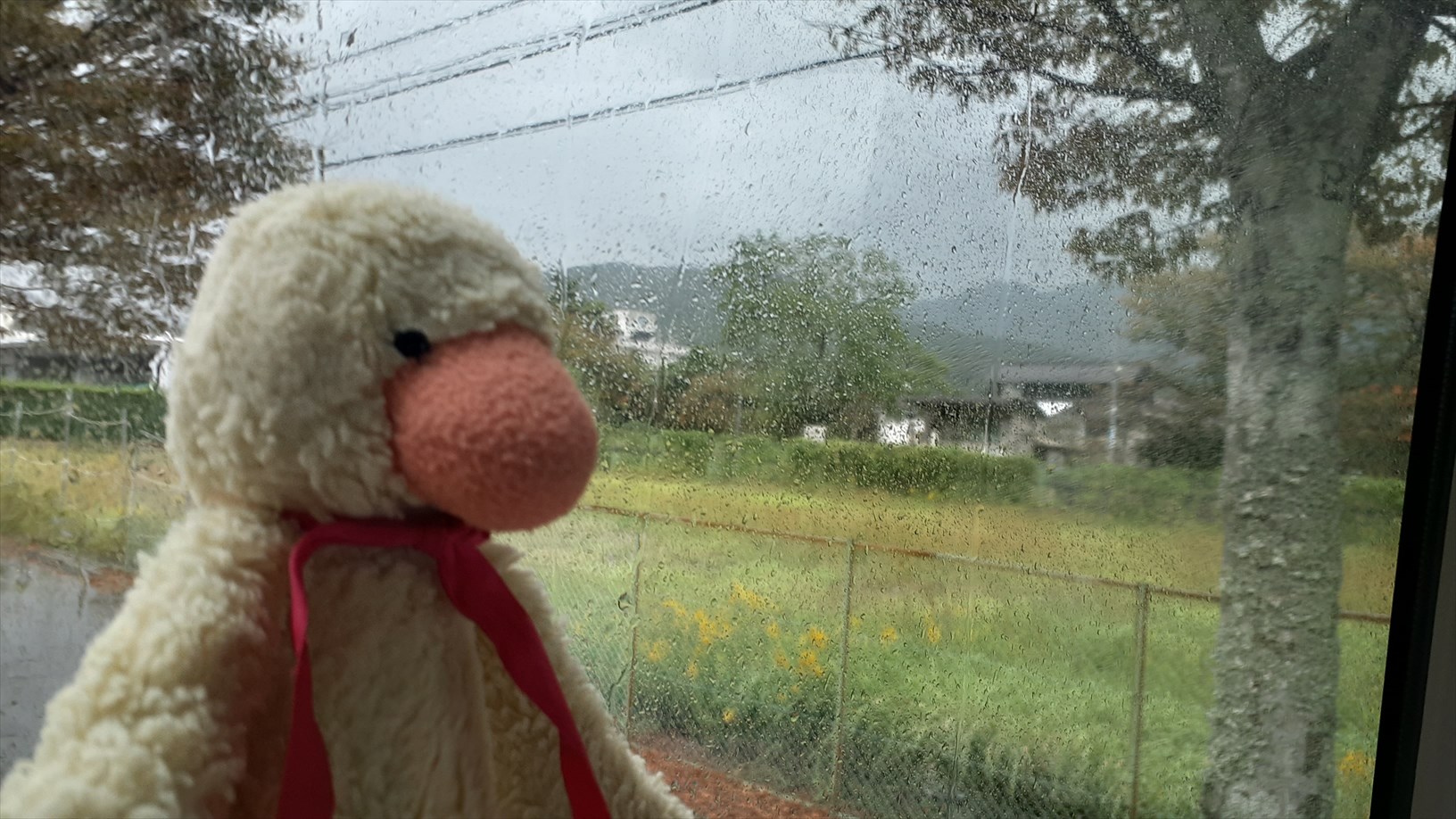 2号車は片側の窓向きに並んでいて、たけじろうは山側の窓。(曇天ビュー)
