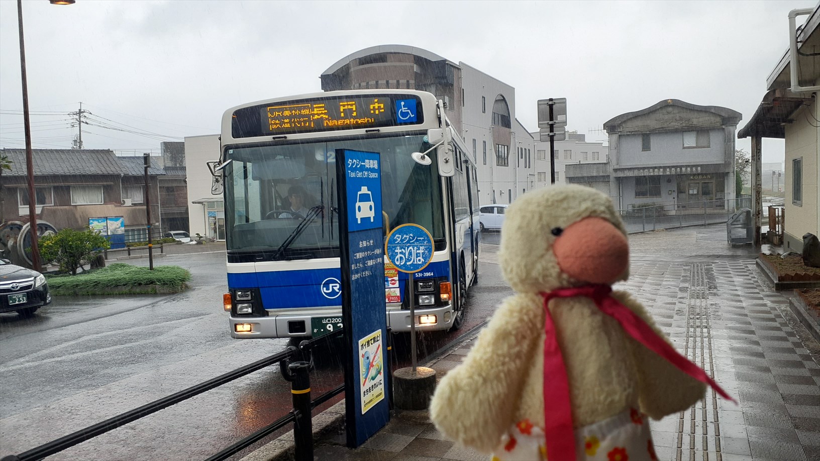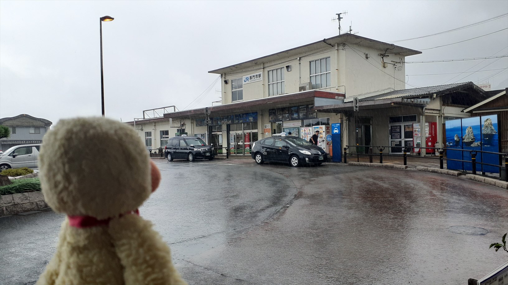 長門市駅に着きましたが、ザーザー降り。