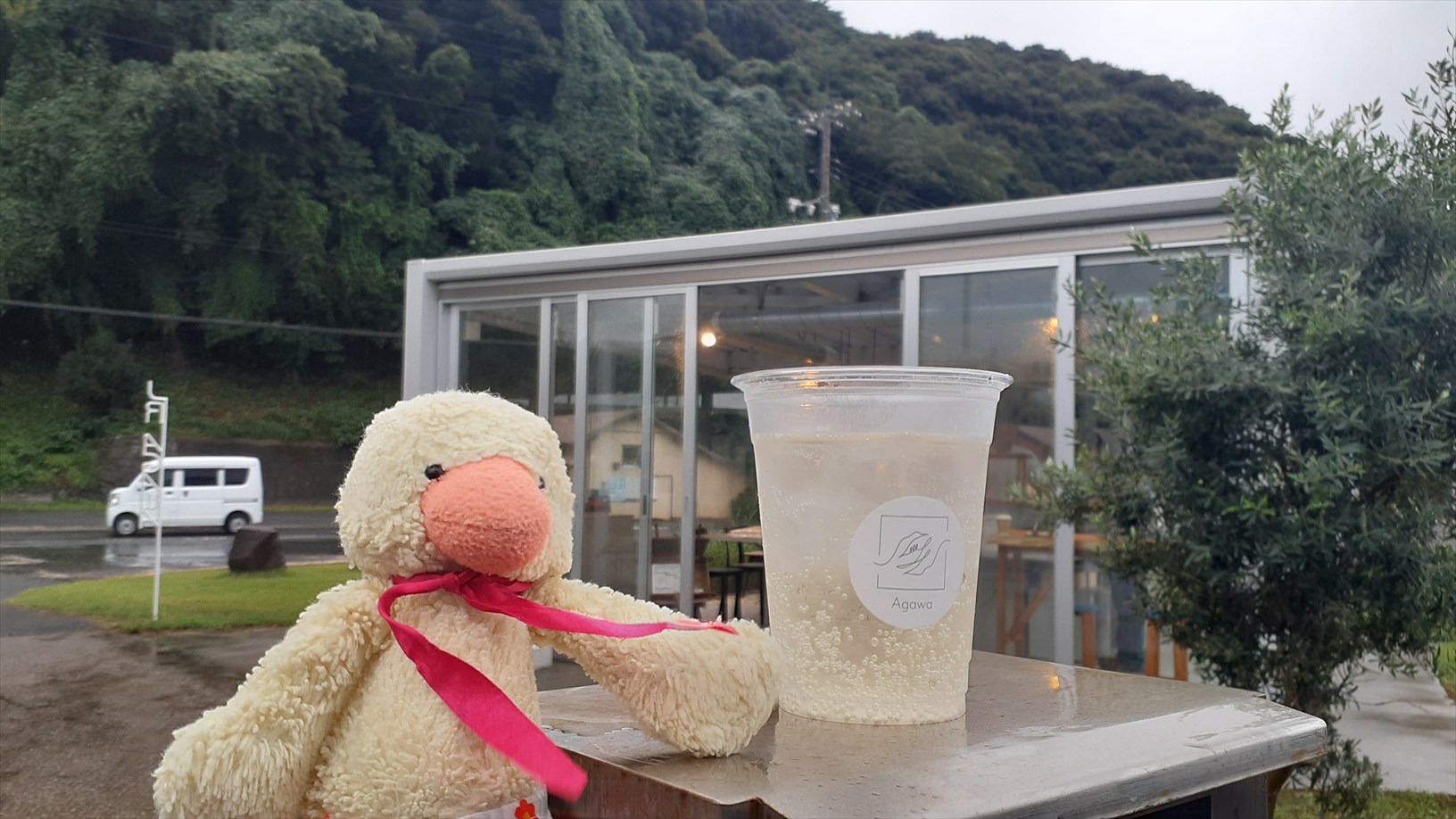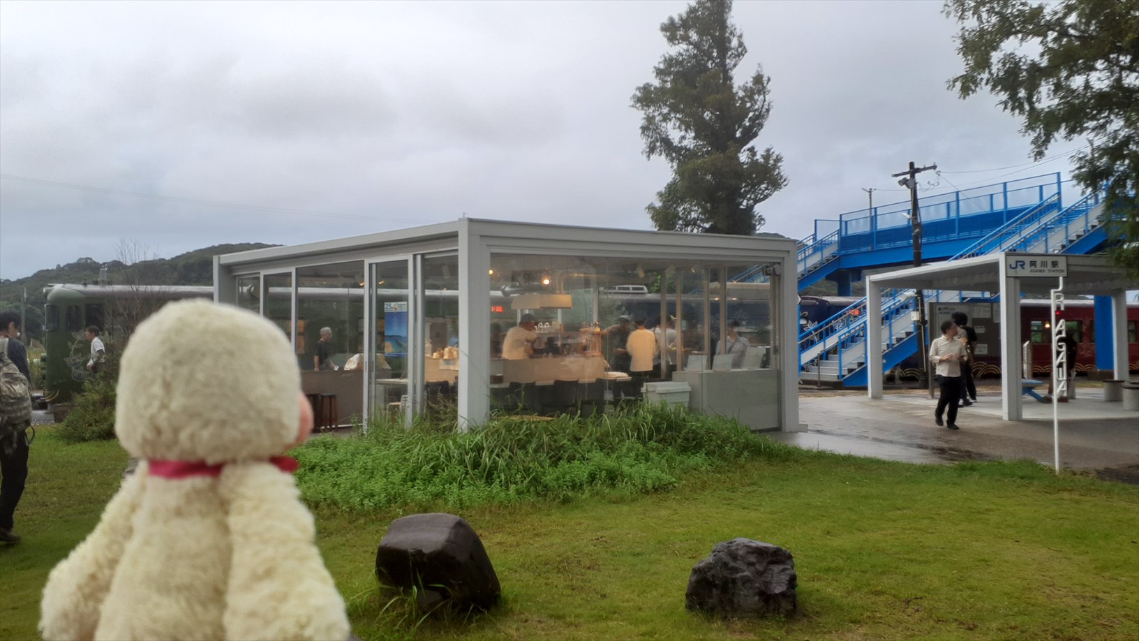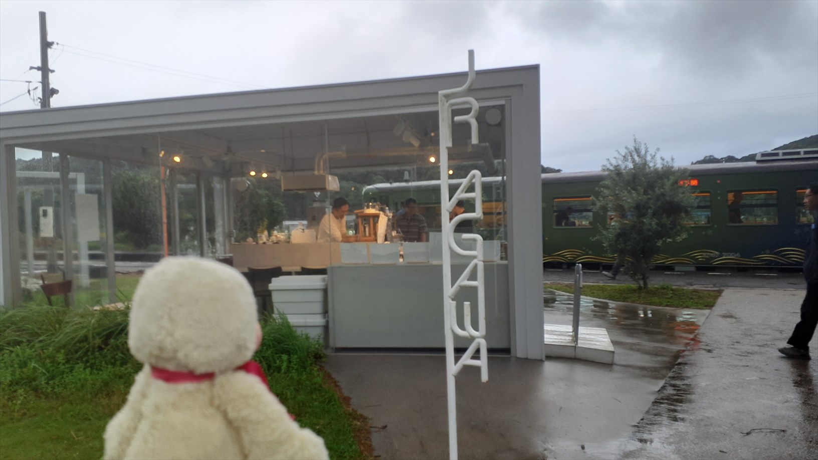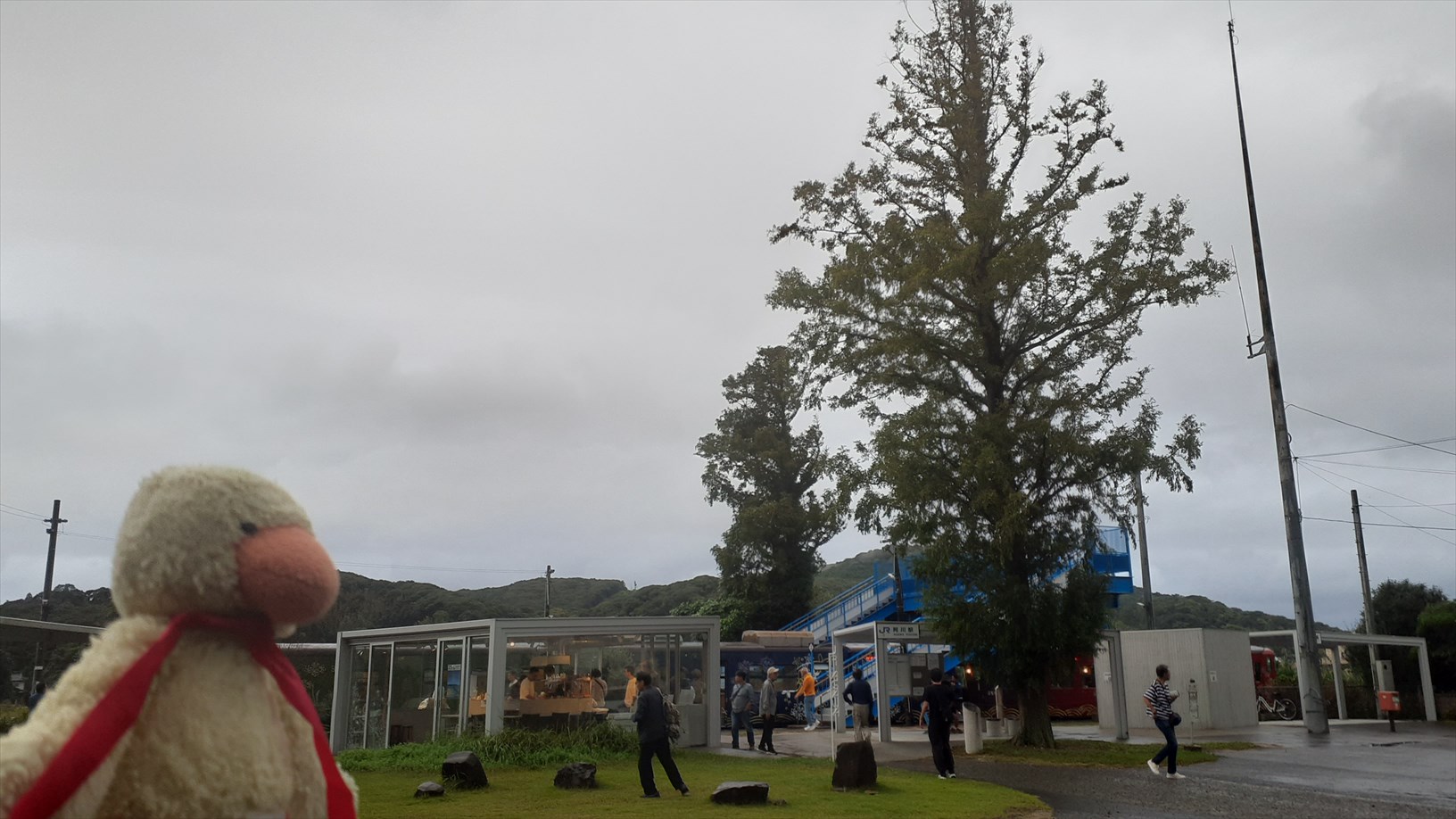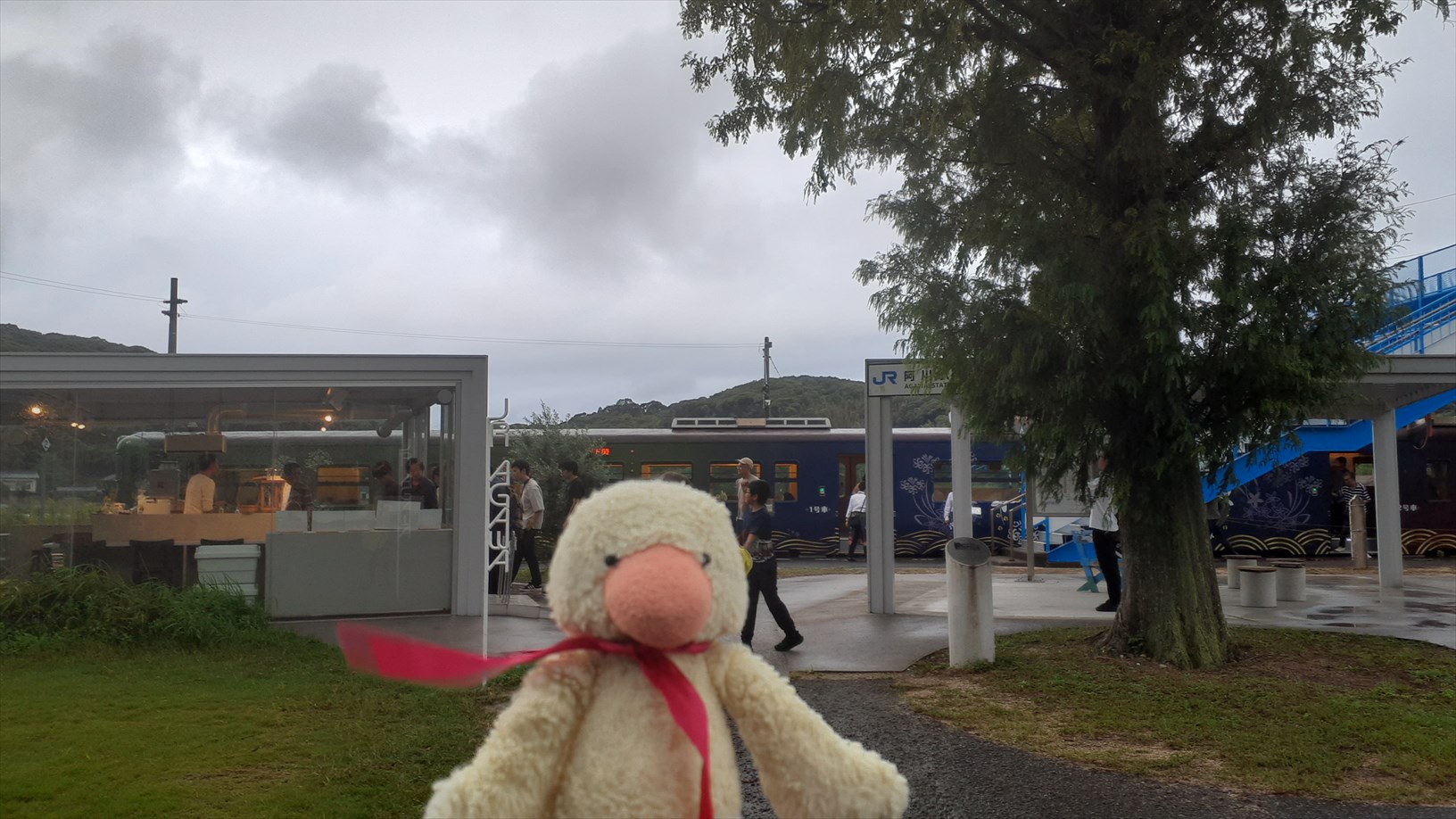 駅は開放的で、駅舎もなくホームから駅前広場が広がって、カフェや巨木が見渡せます。