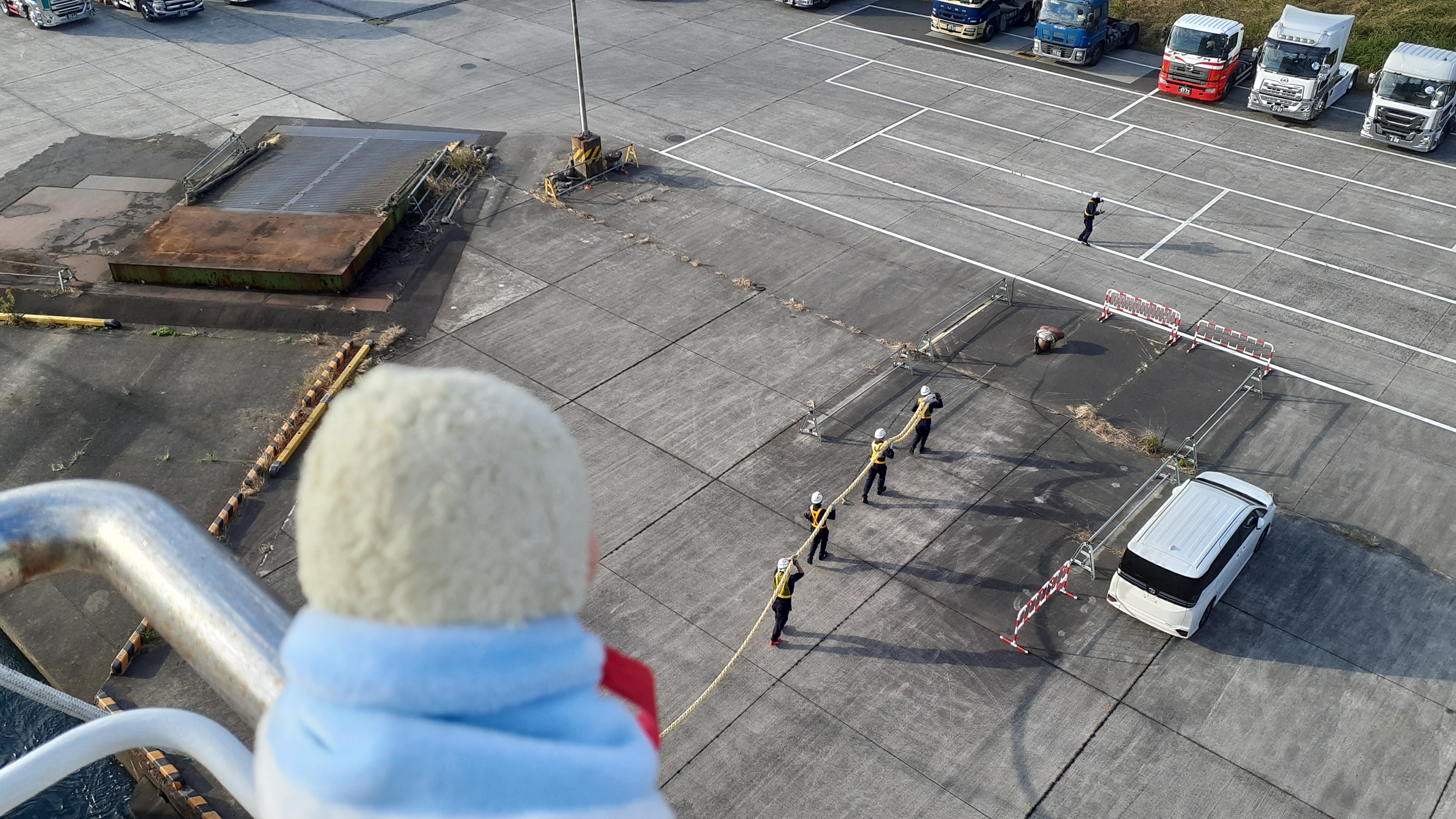 フェリーからロープが港に投げられ、作業員がロープを引っ張ります。