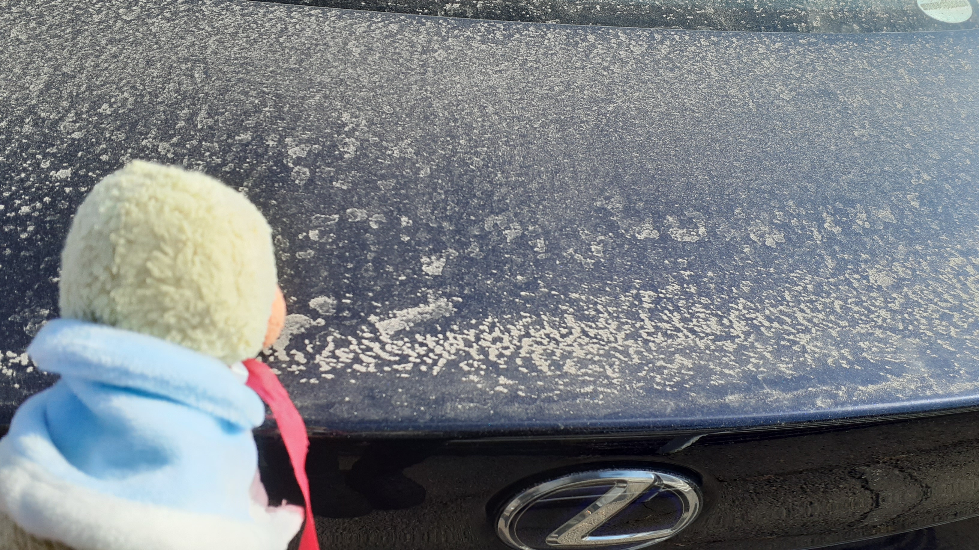 が!!!停まってる車は、、火山灰がビッシリ!(えっ・・。)