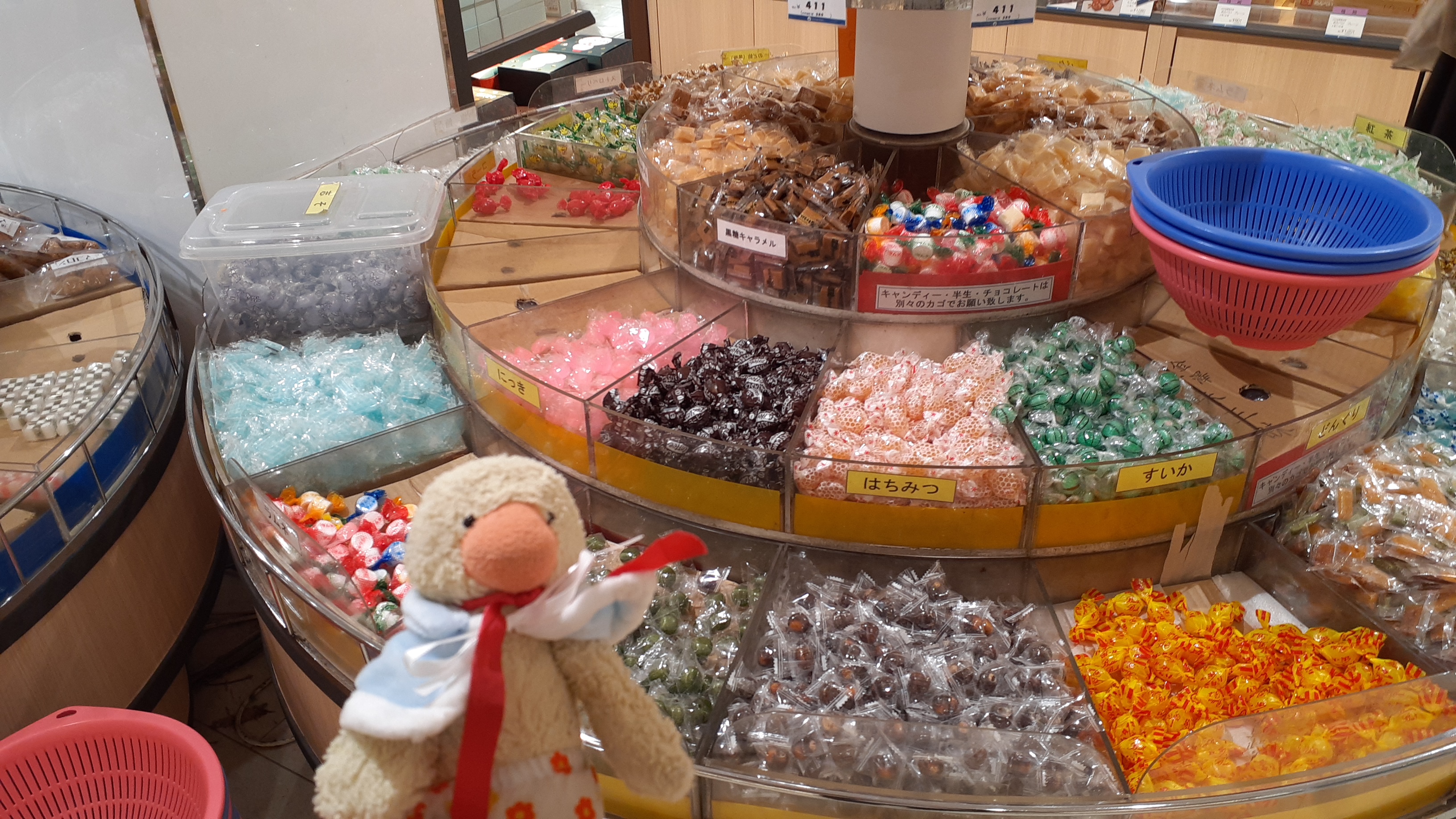 焼きそば、上品で美味しかった! そして、デパ地下へ。ぐるぐる回転するお菓子の量り売り!(懐かしい)