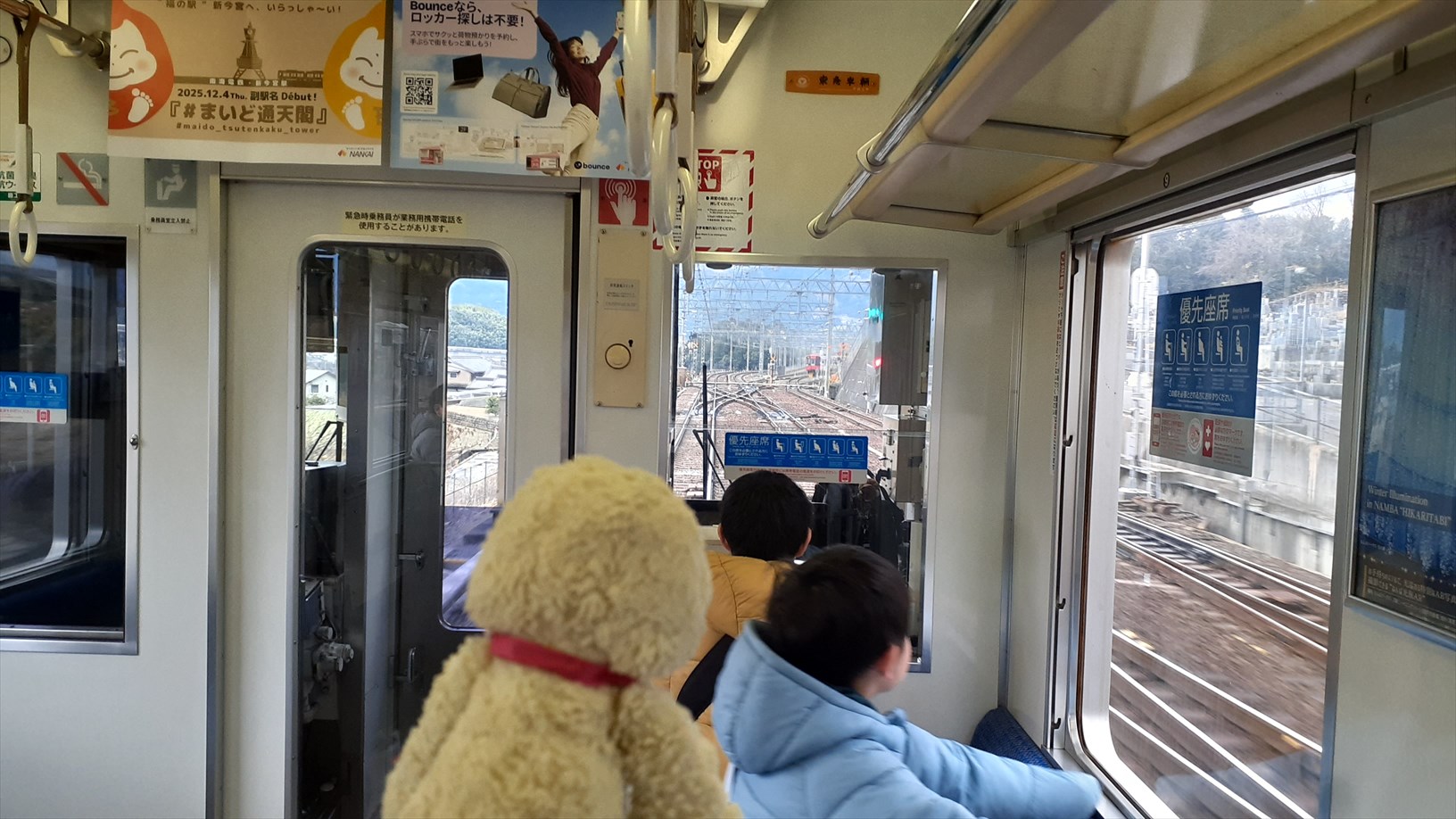 2000系の急行ズームカーは なんば駅を出発。途中からは電車好きのお子たちも運転席の後ろに集まります。