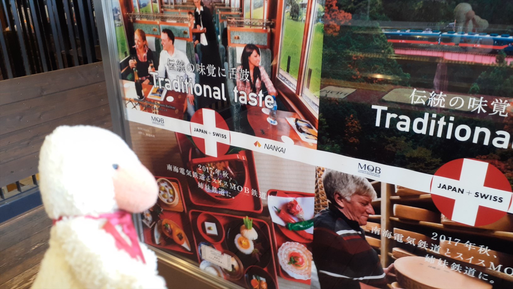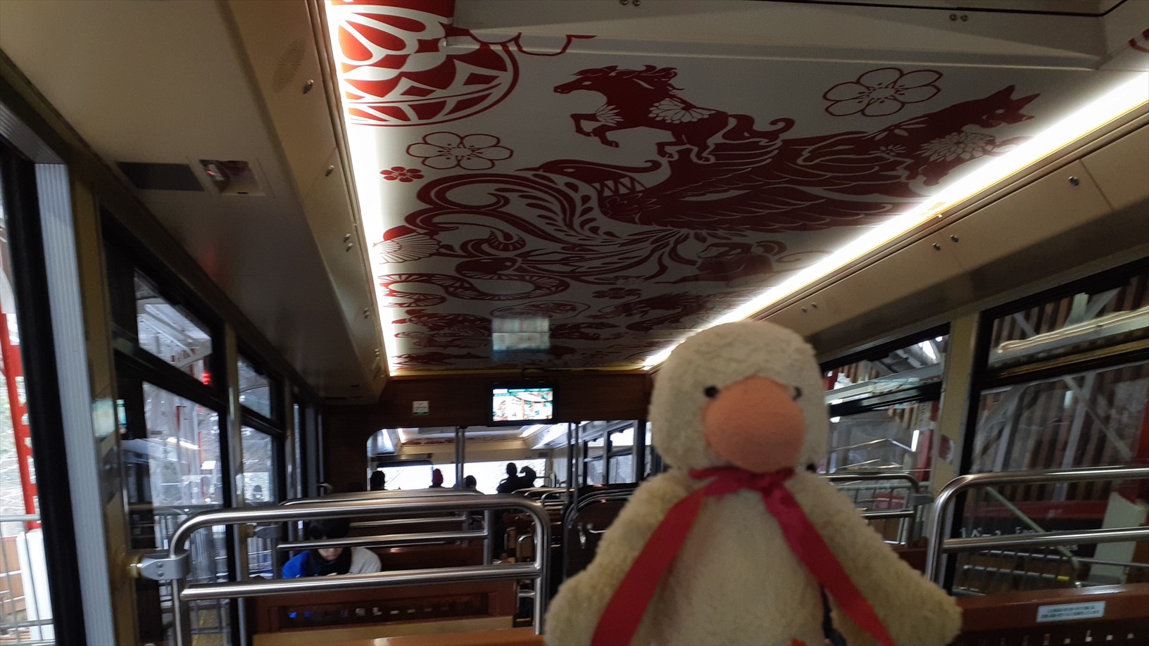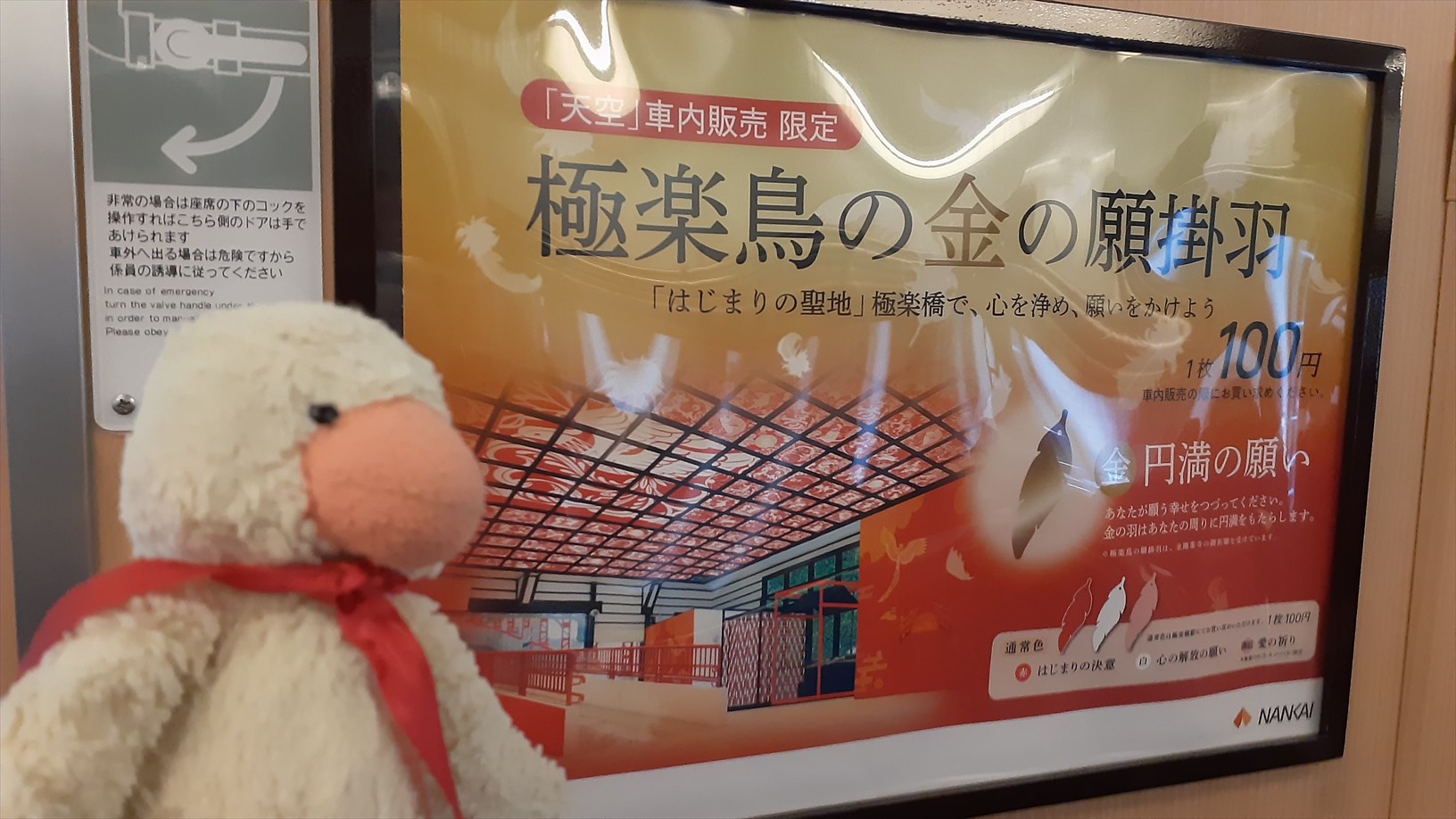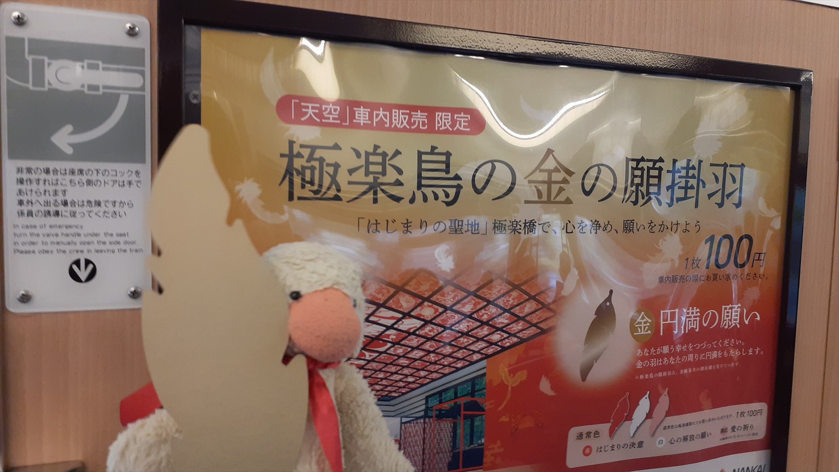 運転台の後ろにある広告枠に・・・「極楽鳥の金の願掛羽」。むむっ!